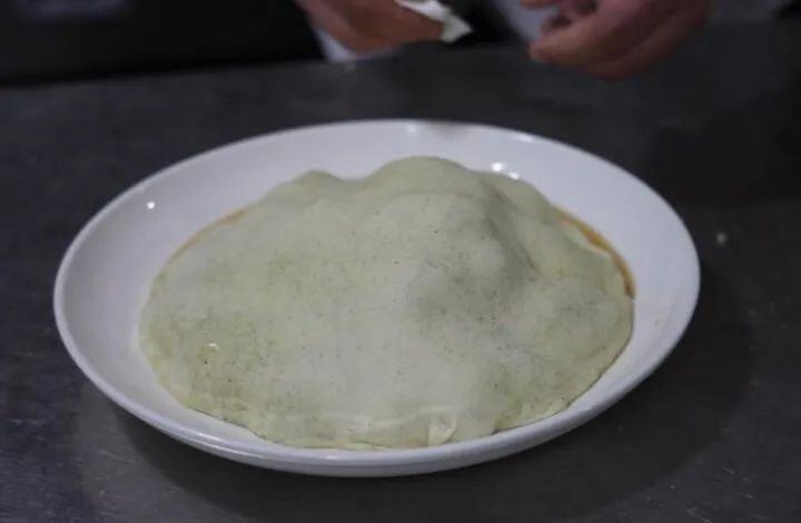 最后一步,也是这道美食的点睛之笔——蒸制。用老酵发面制作面饼,将面饼擀成盘子大小,严严实实地盖在装有羊羔肉的盘子上面。这层面饼能紧紧锁住羊羔肉的香味及营养,防止其随水蒸气流失。将盘子放入蒸笼,蒸制40分钟。期间,面饼慢慢吸收羊羔肉的鲜美汤汁,变得酥软而富有层次,而羊羔肉也在水蒸气的环绕下,变得更加鲜嫩多汁,两者相互交融,形成了一种独特而美妙的口感。