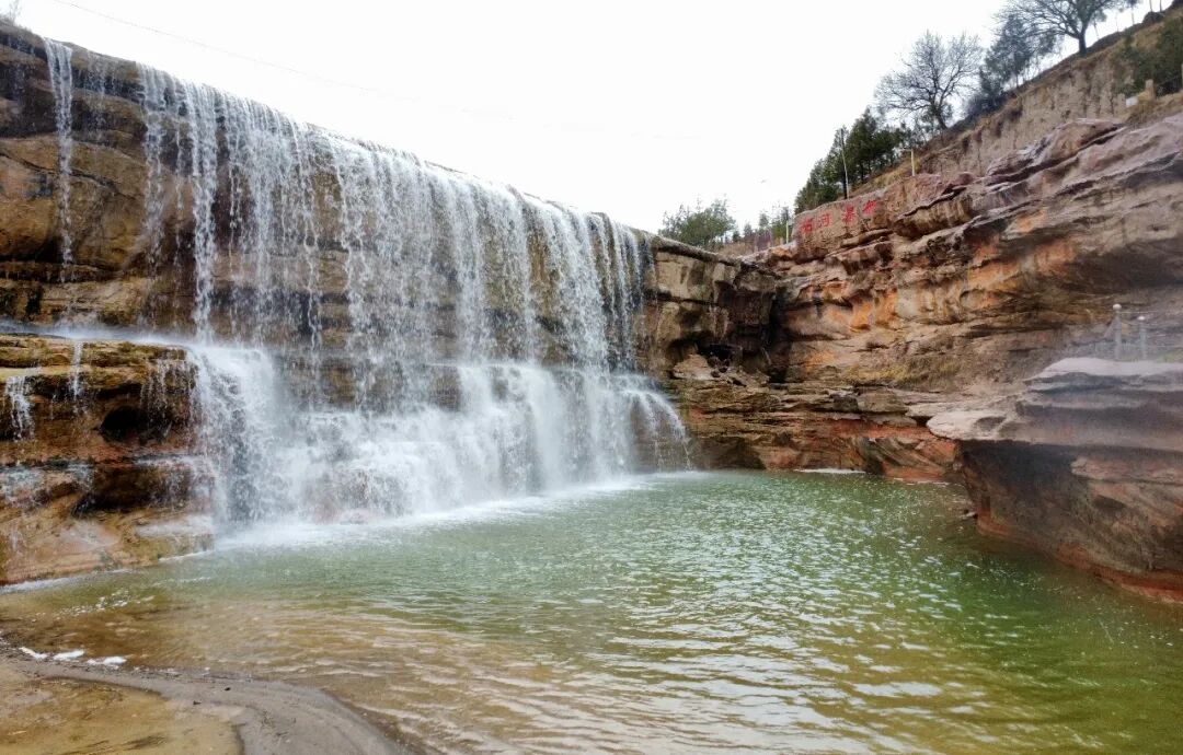 彭阳茹河瀑布一汪碧水映桃花