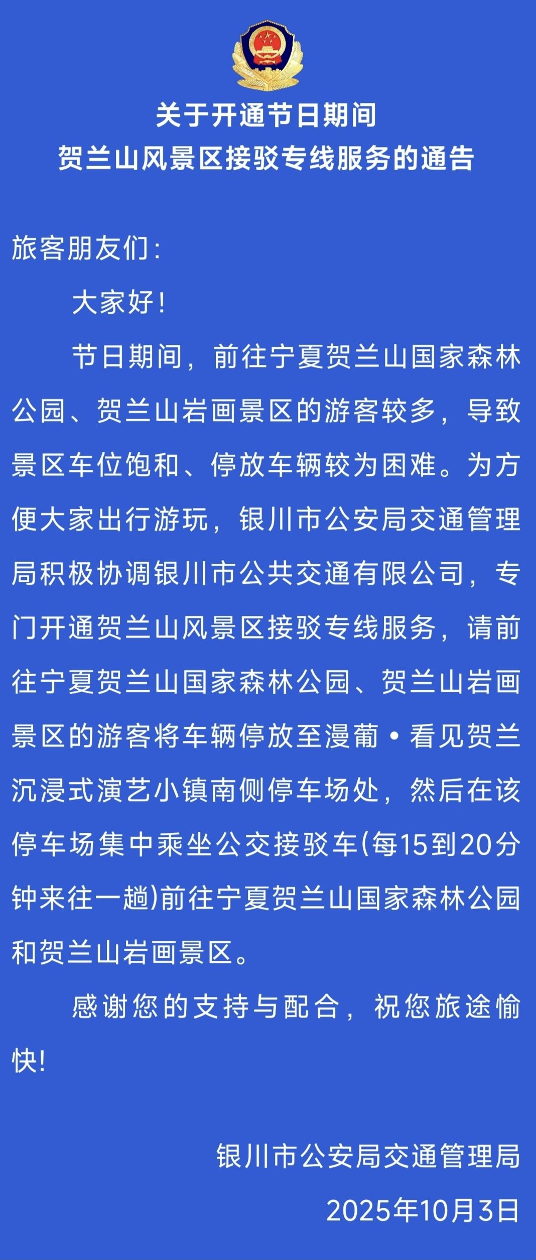贺兰山风景区接驳专线服务的通告
